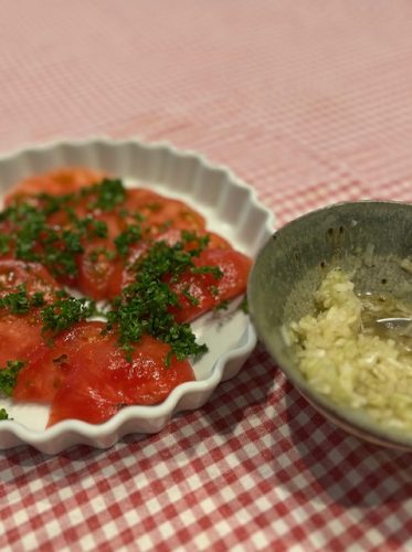 玉ねぎのみじん切りで作ったドレッシングをかけて5〜6時間味を馴染ませていただきます。